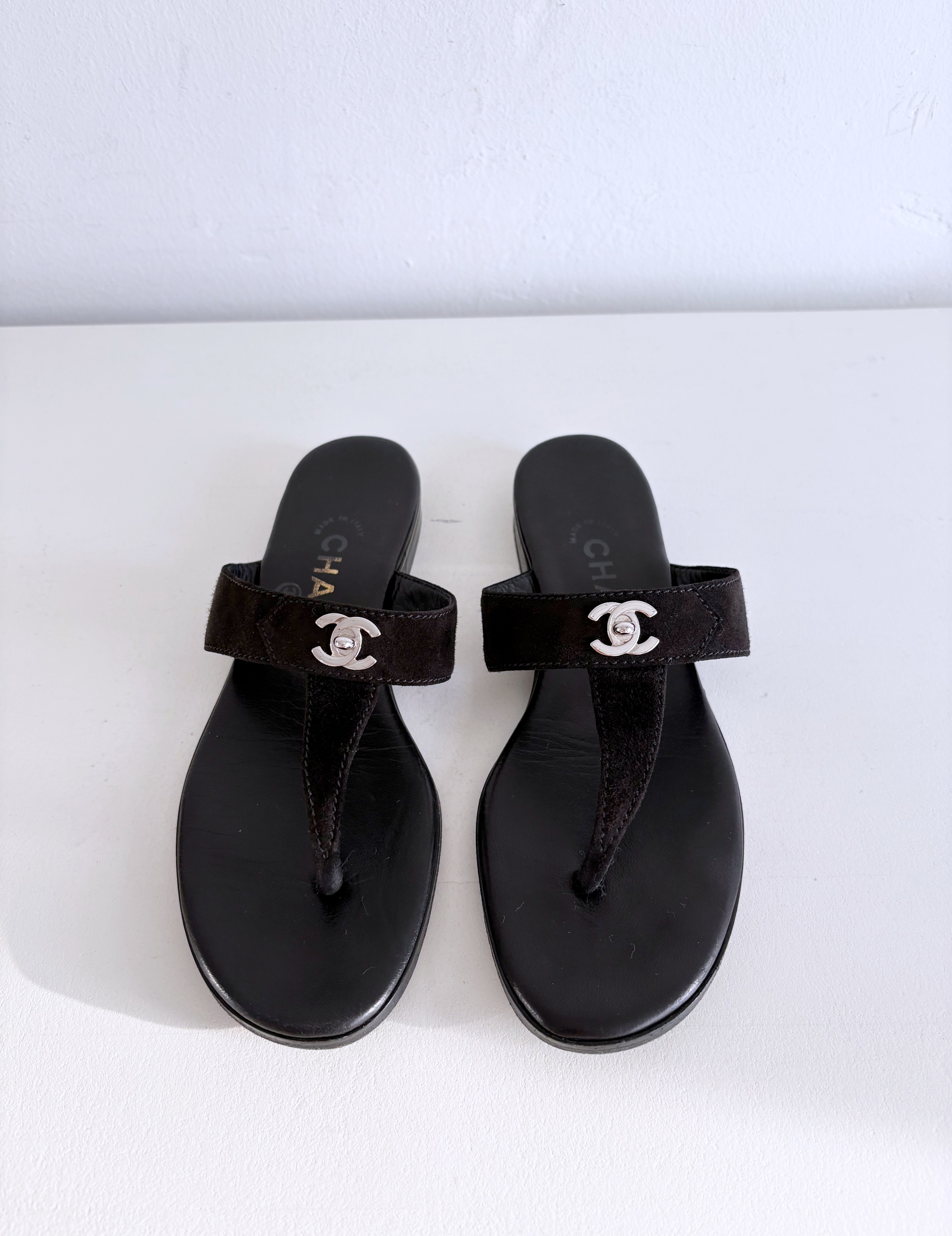 CHANEL CC Logo Suede Leather Flip-Flops (35.5)