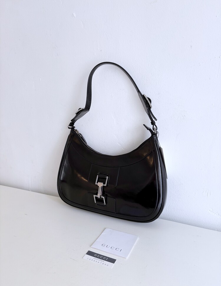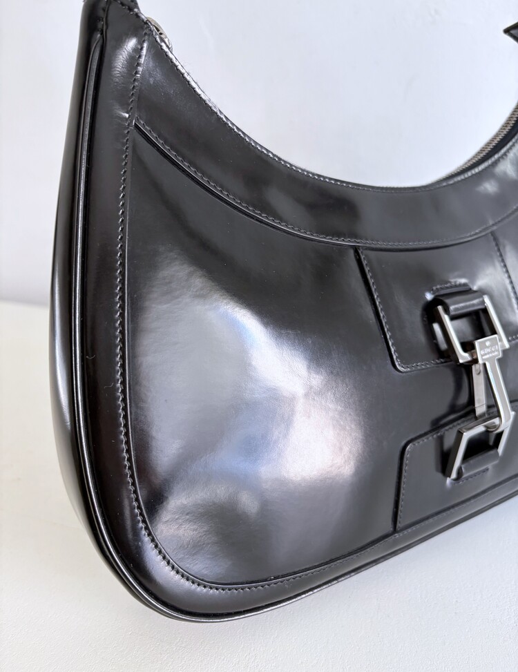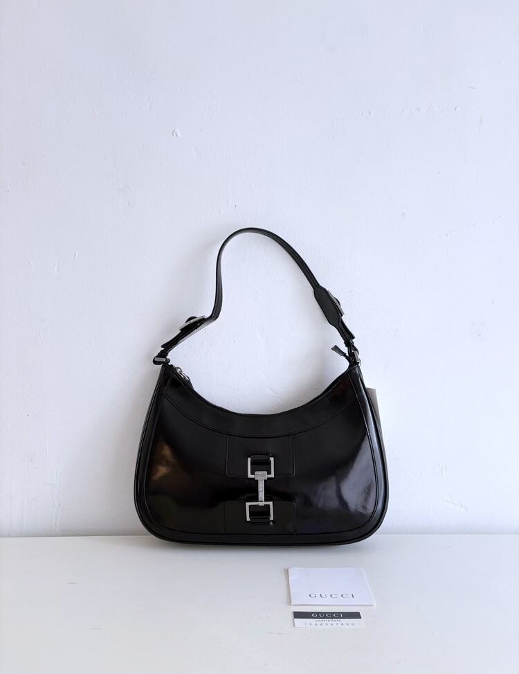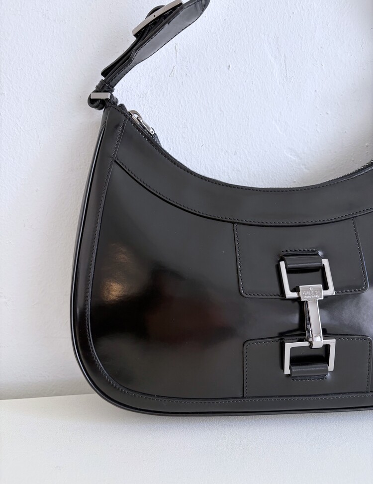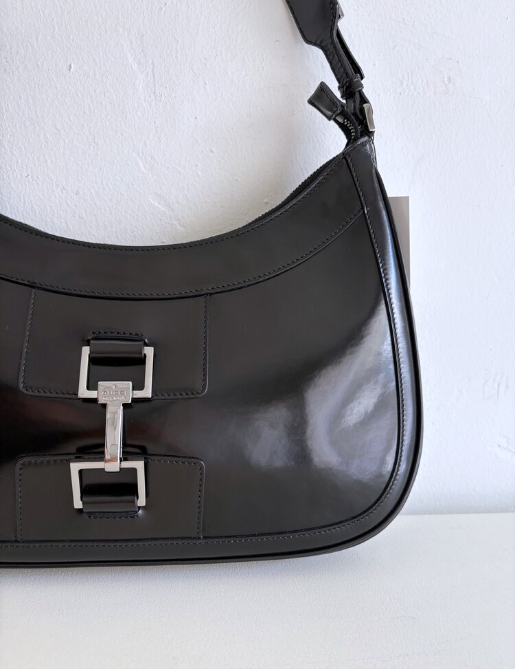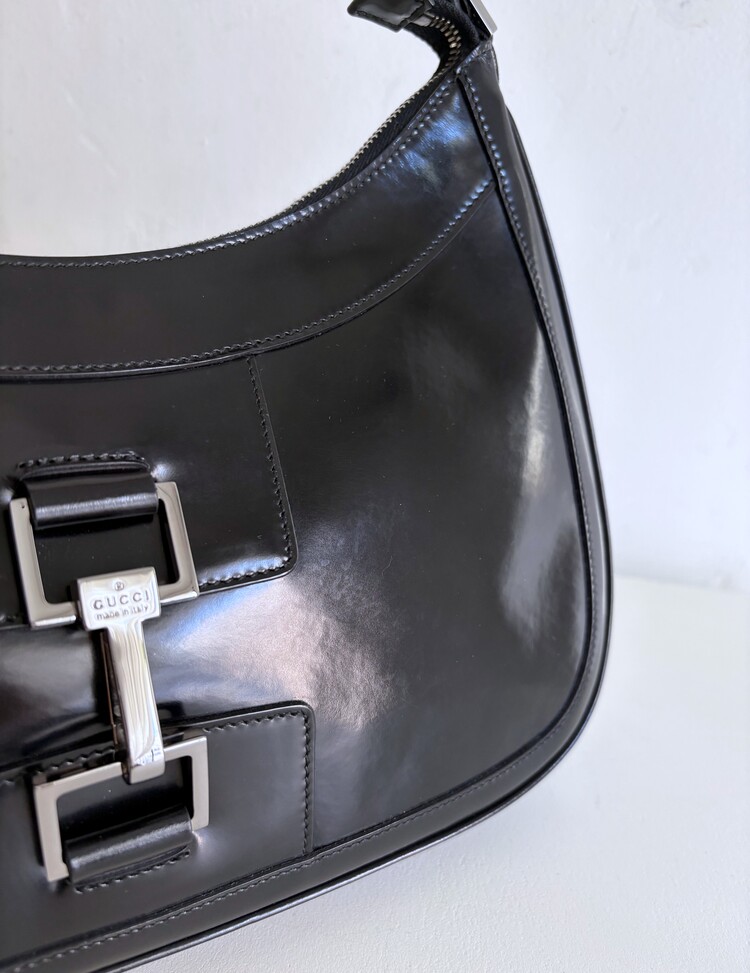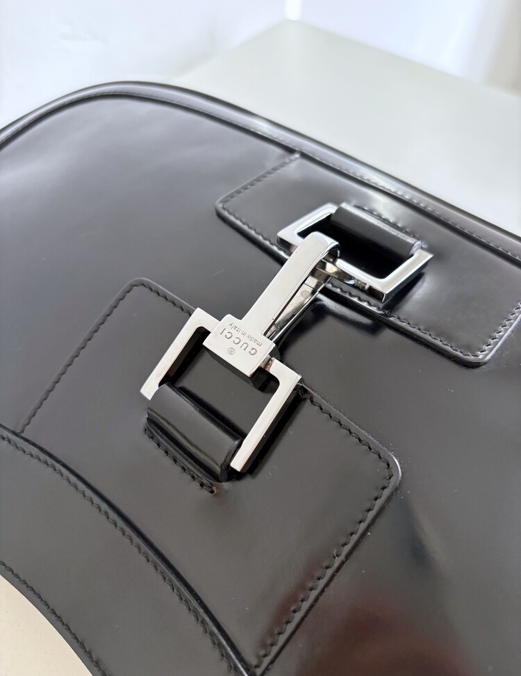 GUCCI Brushed Leather Logo Buckle Shoulder Bag